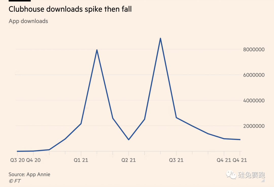 面對著多個Clubhouse復(fù)制款的強(qiáng)勢來襲,Clubhouse自身的城墻也開始出現(xiàn)裂縫,比如大批涌入的用戶導(dǎo)致app時常宕機(jī),平臺上的語音聊天常常出現(xiàn)虛假信息和極端言論,而Clubhouse對其無能為力也毫不作為,這些都成為了Clubhouse的軟肋,到2021年下半年時它的增長明顯放緩,據(jù)App Annie的數(shù)據(jù)顯示,在6月時它的下載數(shù)達(dá)到了900萬的高峰,而在11月時這一數(shù)字僅有92萬了。