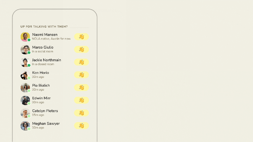 比如和TED進(jìn)行合作在語音聊天室內(nèi)進(jìn)行獨家演講內(nèi)容的播送,跟Stripe合作讓Clubhouse上的內(nèi)容創(chuàng)作者可以賺錢,在2021年9月推出了叫做“Wave”的招手功能,讓用戶可以通過點擊“ ”的emoji快速邀請好友加入語音聊天,鼓勵更加隨性和自然的社交行為