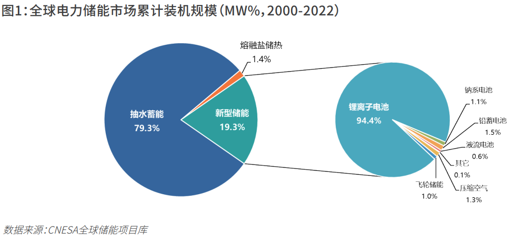 據(jù)中國能源研究會(huì)儲(chǔ)能專委會(huì)/中關(guān)村儲(chǔ)能產(chǎn)業(yè)技術(shù)聯(lián)盟(CNESA)全球儲(chǔ)能項(xiàng)目庫的不完全統(tǒng)計(jì),截至2022年底,全球已投運(yùn)電力儲(chǔ)能項(xiàng)目累計(jì)裝機(jī)規(guī)模237.2GW,年增長(zhǎng)率15%。抽水蓄能累計(jì)裝機(jī)規(guī)模占比首次低于80%,與2021年同期相比下降6.8個(gè)百分點(diǎn);新型儲(chǔ)能累計(jì)裝機(jī)規(guī)模達(dá)45.7GW,是去年同期的近2倍,年增長(zhǎng)率80%,鋰離子電池仍占據(jù)絕對(duì)主導(dǎo)地位,年增長(zhǎng)率超過85%,其在新型儲(chǔ)能中的累計(jì)裝機(jī)占比與2021年同期相比上升3.5個(gè)百分點(diǎn)。