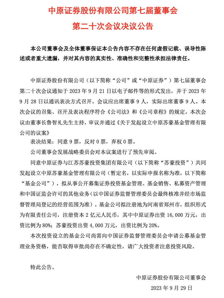 公告顯示,注冊資本2.00億元,其中中原證券出資1.60億元,出資比例為80%;蘇豪投資出資 4000萬元,出資比例為20%。中原證券表示,本次投資設立的基金公司尚需向中國證券監(jiān)督管理委員會申請公募基金管理業(yè)務資格,能否取得審批尚存在不確定性。