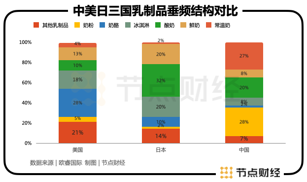 而我國(guó)2022年排名最靠前的三大乳制品品類(lèi)是“常溫奶(27%)、嬰幼兒奶粉(25%)、酸奶(20%)”