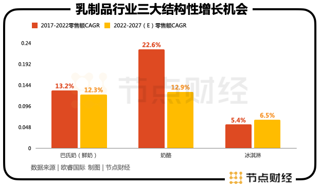 算上液態(tài)奶中的鮮奶,其2019年-2022年的復(fù)合增速為13.2%,被預(yù)測(cè)2022年-2027年的復(fù)合增速為12.3%。在乳制品行業(yè)中,“奶酪、鮮奶、冰淇淋”三大最顯見(jiàn)的結(jié)構(gòu)性機(jī)會(huì)已經(jīng)出現(xiàn)了。