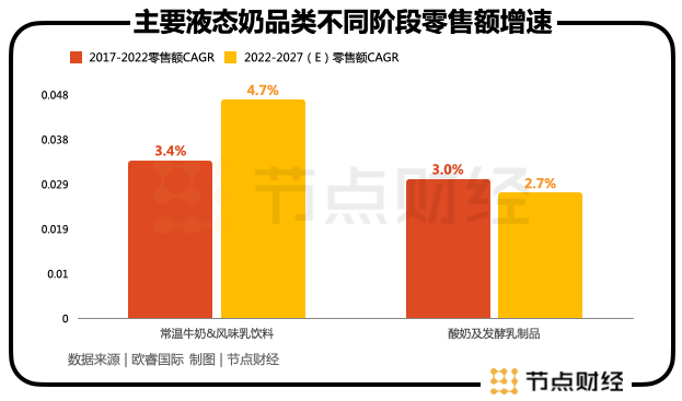 歐睿國(guó)際預(yù)測(cè):2022年-2027年,上述兩大細(xì)分品類(lèi)的市場(chǎng)規(guī)模復(fù)合增速分別為2.7%與4.7%。言外之意是“常溫牛奶與風(fēng)味乳酸飲料”增速還將進(jìn)一步放緩,酸奶有小幅提升。