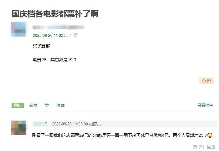 國慶檔電影開預(yù)售的這兩天,各個(gè)社交平臺出現(xiàn)了不少曬票價(jià)的帖子。不過這一次,觀眾沒再沉迷抱怨高價(jià)電影票,一反常態(tài)地比起了誰買到的票價(jià)更低。