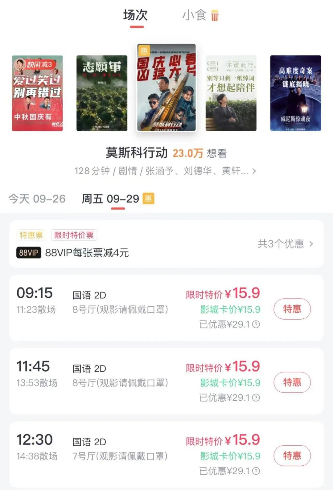 以活動(dòng)力度較大的淘票票為例,在預(yù)售開啟首日,犀牛君點(diǎn)進(jìn)了北京一家影院的《莫斯科行動(dòng)》首映日場次,看到有充足的低價(jià)場次可選。價(jià)格方面,在19.9的票價(jià)基礎(chǔ)上,還可以疊加88VIP的優(yōu)惠,合計(jì)一張電影票只需15.9元。