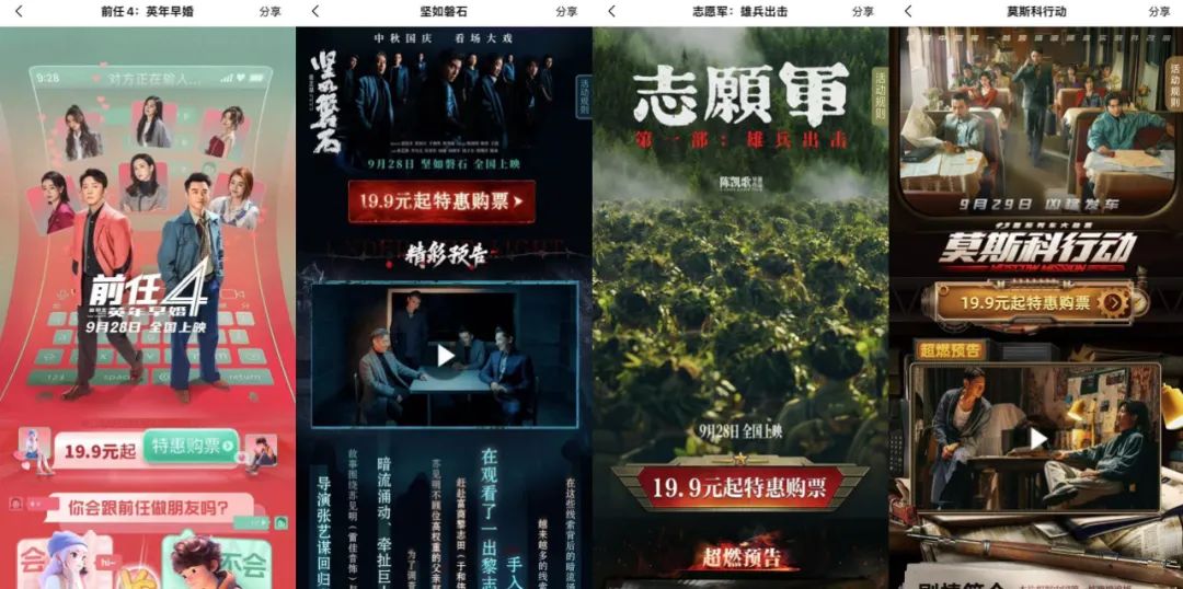 而犀牛君也發(fā)現(xiàn),今年國慶檔新片似乎不約而同地打起了價(jià)格戰(zhàn),在淘票票、貓眼平臺首頁,均可看到《前任4:英年早婚》《堅(jiān)如磐石》《志愿軍:雄兵出擊》《好像也沒那么熱血沸騰》《貝肯熊:火星任務(wù)》《莫斯科行動(dòng)》等國慶檔新片19.9元起特惠購票的橫幅廣告。