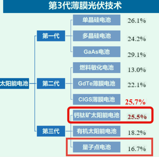 第三代基于高效、綠色環(huán)保和先進(jìn)納米技術(shù)的新型薄膜太陽能電池,如染料敏化太陽能電池(DSSCs)、 鈣鈦礦太陽能電池(PSCs)和量子點(diǎn)太陽能電池(QDSCs)等。