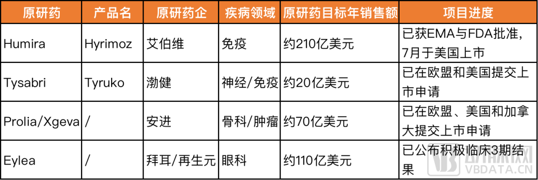 由于與諾華分離早已成定數(shù),為凸顯公司優(yōu)勢與未來市場價值,山德士近年來持續(xù)在生物類似藥資產(chǎn)發(fā)力,或進行生物類似藥合作。根據(jù)山德士招股書,公司很快將有包括Humira、Tysabri、Prolia和Eylea在內(nèi)的四大關(guān)鍵生物類似藥產(chǎn)品上市,這些藥物的年銷售額超過400億美元。