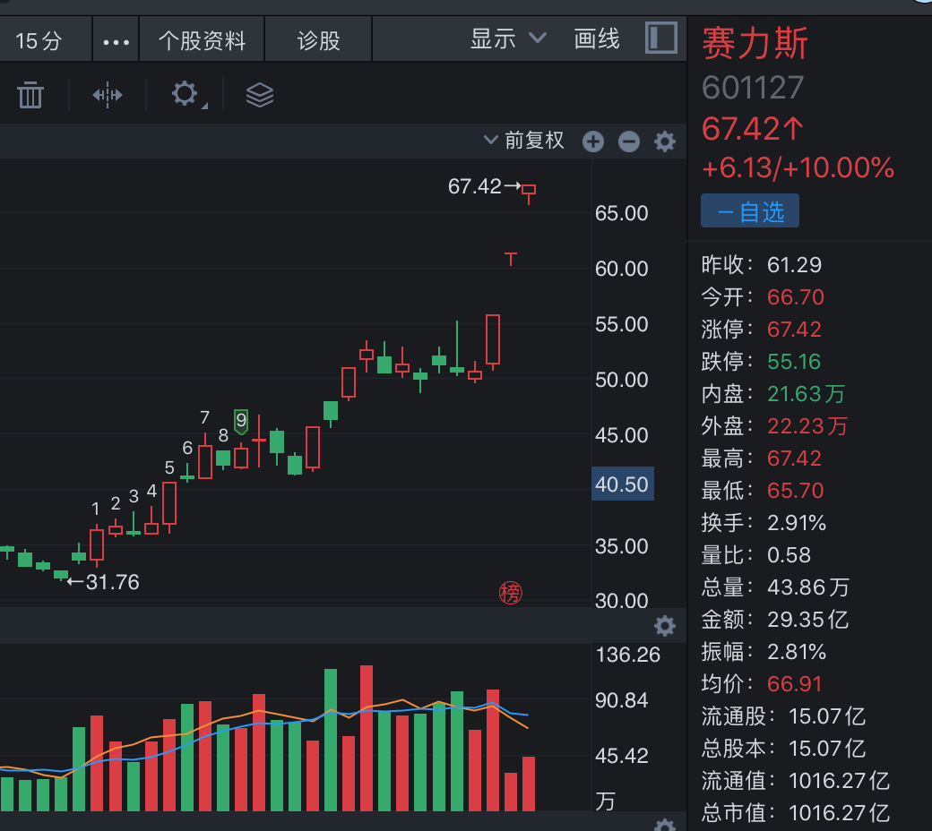 作為“華為汽車”概念股的代表,賽力斯(601127.SH)已連續(xù)完成了3個(gè)漲停板。從這輪上漲之初的8月28日算起,截至10月10日,賽力斯累計(jì)漲幅已超過110%。