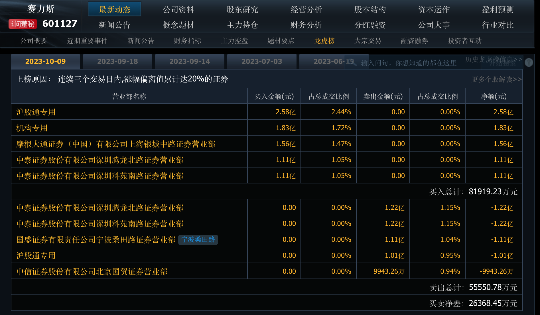 10月9日披露的連續(xù)三個(gè)交易日龍虎榜顯示,賽力斯的大漲,是機(jī)構(gòu)和游資的合力所為。買1席位是“滬股通專用”席位,買入金額2.58億元;買2席位是“機(jī)構(gòu)專用”席位,買入金額1.83億元;其他躋身前五的買家還有摩根大通上海銀城中路營(yíng)業(yè)部、中泰證券深圳騰龍北路營(yíng)業(yè)部、中泰證券深圳科苑南路營(yíng)業(yè)部。
