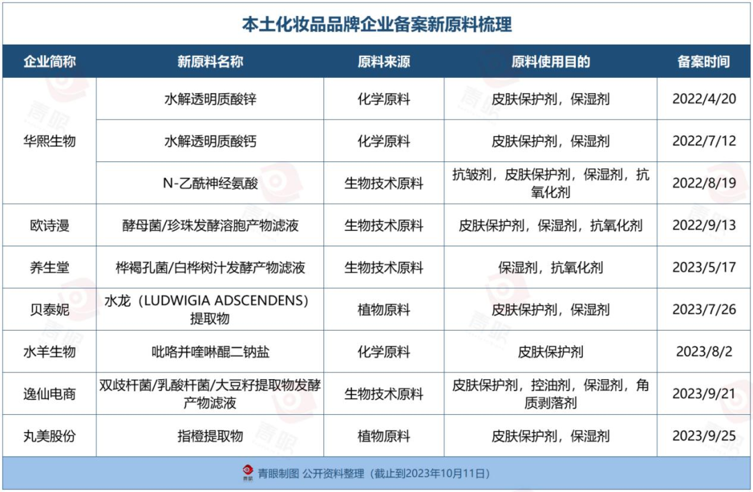 而伴隨企業(yè)研發(fā)實力的提升,消費者對中國成分概念認(rèn)知逐漸加強,這份名單越來越長,品牌在科研投入的深度與成分應(yīng)用的廣度上也較之前有所精進。典型如,在化妝品新原料的申報上,本土化妝品品牌企業(yè)紛紛嶄露頭角,僅今年,已有貝泰妮、水羊股份、丸美、逸仙電商、養(yǎng)生堂等多家品牌企業(yè)完成新原料備案。