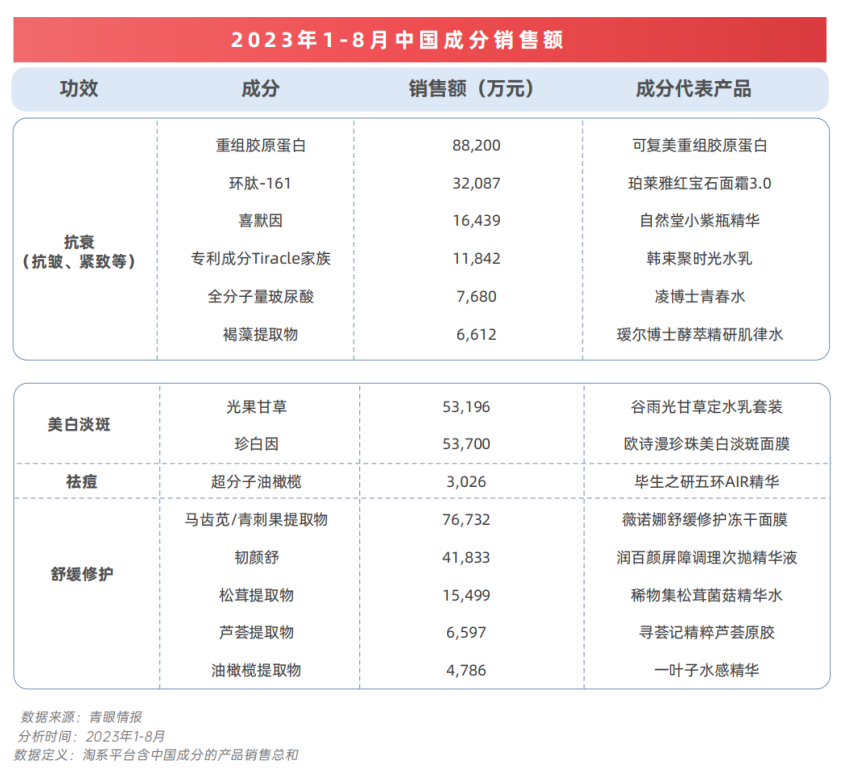 青眼情報從淘系1-8月銷量Top500的護膚品中篩選出了中國成分產(chǎn)品,其中,重組膠原蛋白產(chǎn)品銷售總額超過8.8億元,馬齒莧/青刺果提取物、光果甘草與珍白因的銷售額也均超過5億,以上4個成分所對應(yīng)的功效分別為抗衰、舒緩修護和美白。