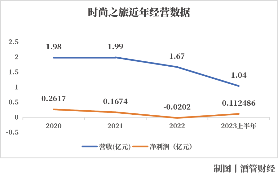 數(shù)據(jù)顯示,賣身之初的時(shí)尚之旅,在2012年?duì)I收9000多萬元。而進(jìn)入錦江體系之后的2020年~2022年,時(shí)尚之旅營收分別為1.98億元、1.99億元、1.67億元,凈利潤分別為2617萬元、1674萬元、-202萬元。在2023年上半年,公司營收和凈利潤分別為1.04億元和1124.86萬元。