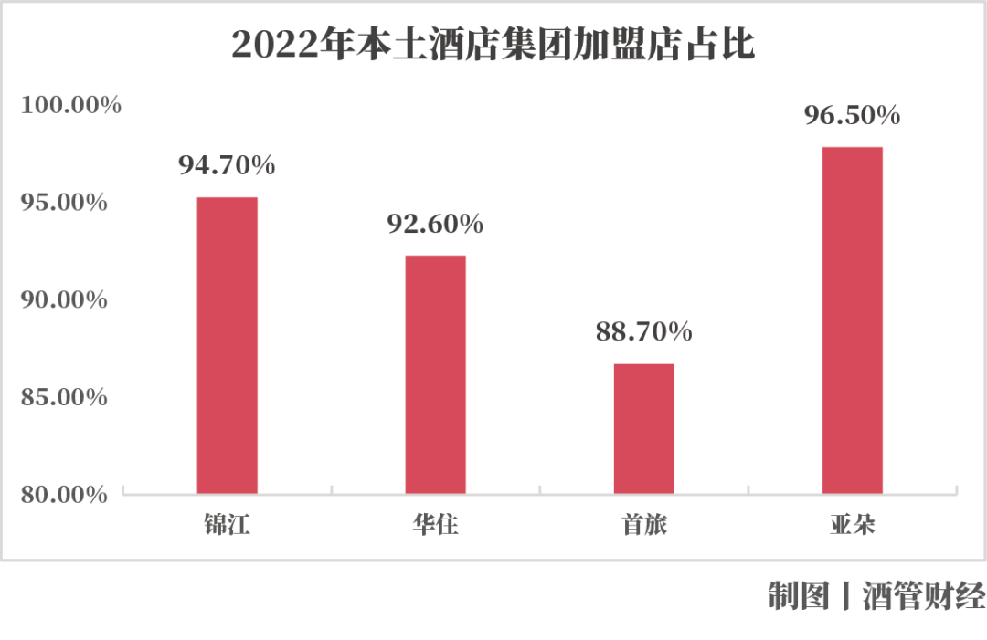 橫向?qū)Ρ纫幌?,截?2022 年底,錦江、華住、首旅的境內(nèi)加盟酒店占比分別為 94.7%、92.6%和 88.7%。新銳酒店集團(tuán)亞朵同期比例更高,為96.5%。