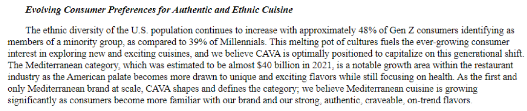 從Cava這家公司的發(fā)展過程也可以看到,它是第一家也是唯一一個規(guī)?;l(fā)展的地中海餐飲品牌,有了這個強(qiáng)大的定位,資本市場就會給它很大的期待和很高的估值。