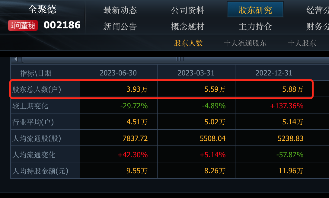 不過(guò)值得留意的是,全聚德在2022年年末股東總戶數(shù)達(dá)到5.88萬(wàn)戶之后,半年里,這一數(shù)據(jù)又再度出現(xiàn)下降,6月末為3.93萬(wàn)戶,籌碼有了漸漸集中的態(tài)勢(shì)。截至6月末人均流通股為7837.72股,人均持股金額為9.55萬(wàn)元。