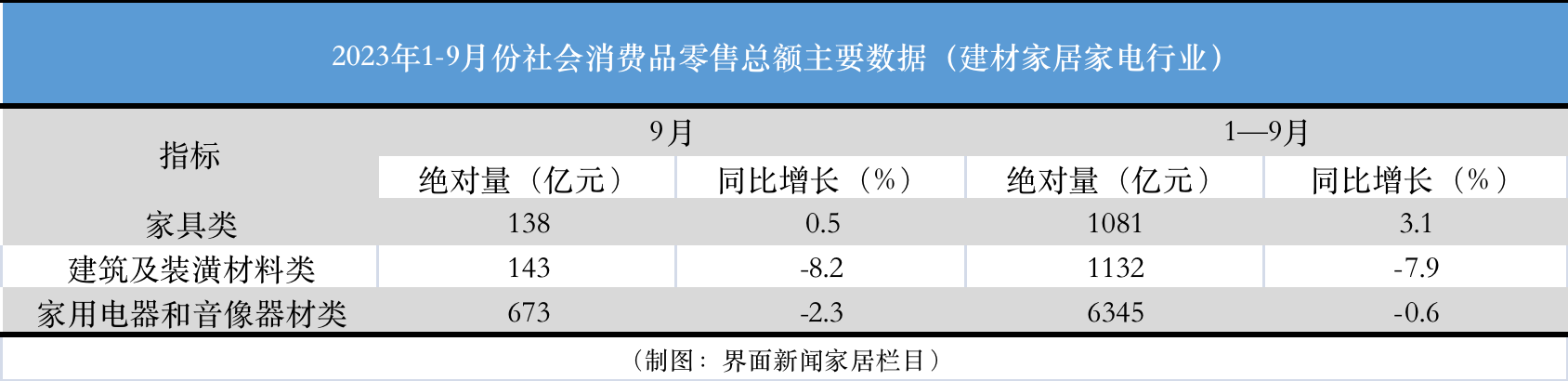 9月家具類零售額環(huán)比增長6%,建筑材料類同比連續(xù)18個(gè)月下滑