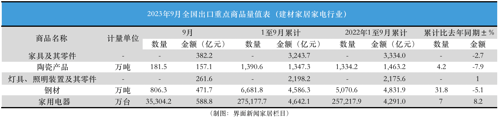 從9月單月來看,家具及其零件出口金額為382.2億元,環(huán)比上漲5.3%;陶瓷產(chǎn)品出口額為157.1億元,環(huán)比上漲2.9%;燈具、照明裝置及其零件出口額為261.6億元,環(huán)比下滑4.6%;鋼材出口額為471.7億元,環(huán)比2.6%;家用電器出口額588.8億元,環(huán)比上漲2%。