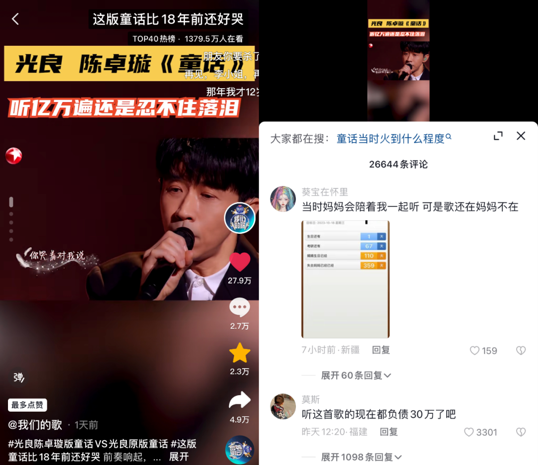 “聽這首歌的現(xiàn)在都負債30萬了吧”“當時媽媽會陪著我一起聽,可是歌還在媽媽不在了”…… 在《童話》舞臺短視頻切片的評論區(qū),熱門評論皆是網(wǎng)友感嘆18年前后聆聽該曲的“我”的生活嬗變。