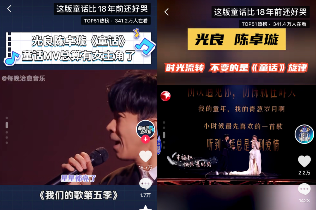 這次音綜版《童話》上抖音熱榜的詞條叫 #這版童話比18年前還好哭# ,這份“好哭”,除了因為歌曲本身內(nèi)容具備跨越時間的經(jīng)典性,再加諸其上的一層,是已然成長的聽眾在18年后以全新心境重聽這首歌的情緒復雜性。