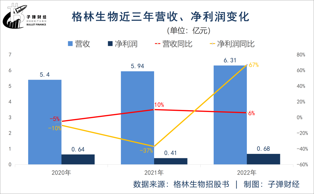 不過,從近三年業(yè)績來看,格林生物營收增長進入瓶頸期。2020年,格林生物營收出現(xiàn)負增長,實現(xiàn)營收5.4億元,同比減少5%。2022年,格林生物實現(xiàn)營收6.31億元,較2021年的5.94億元同比增長6%,但營收增速卻較2021年下滑4個百分點。