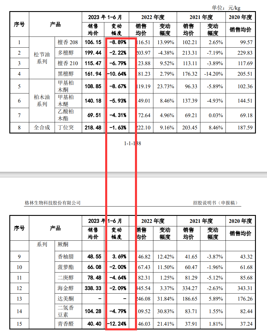 以2021年為例,格林生物主要產品松節(jié)油、柏木油的原材料采購成本較2020年上漲,但產品銷售價格溢價能力有限,導致松節(jié)油系列和柏木油系統(tǒng)產品毛利率分別較上年下滑了17.52個百分點和6.65個百分點,帶動公司毛利率較2020年下降了6.23個百分點進而導致凈利潤大幅下滑。2021年凈利潤下滑也正是格林生物當年主動撤回IPO申請的原因之一。