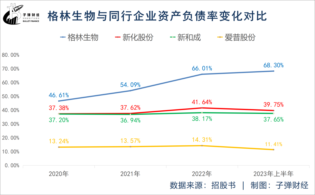 2020年至2023年上半年各期末,格林生物資產負債率呈現(xiàn)逐年攀升的態(tài)勢,從2020年的46.61%增長至2023年上半年的68.3%,遠高于同行業(yè)新化股份、華業(yè)香料、愛普股份、新和成等上市公司。