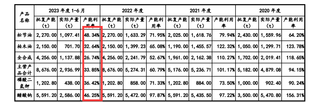 不過,從2023年上半年的產能利用率來看,格林生物的產能利用率并不高。其中,松節(jié)油系列、柏木油系列、全合成系列產品的產能利用率均在50%以下。