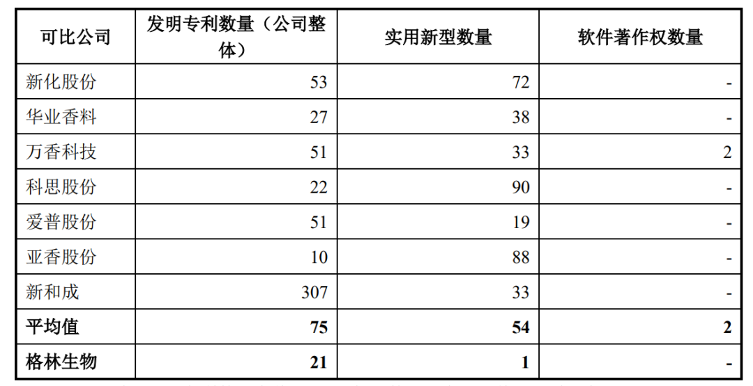 拿研發(fā)方面來說,目前,格林生物共有21項發(fā)明專利,均為2019年及以前獲得,自2020年至2023年6月,格林生物有3項發(fā)明專利提交申請,均在審核中。此外,與新化股份、華業(yè)香料、萬香科技等同行業(yè)公司相比,格林生物的發(fā)明專利也相對較少,行業(yè)可比公司發(fā)明專利均值為75個,而格林生物僅有21個。