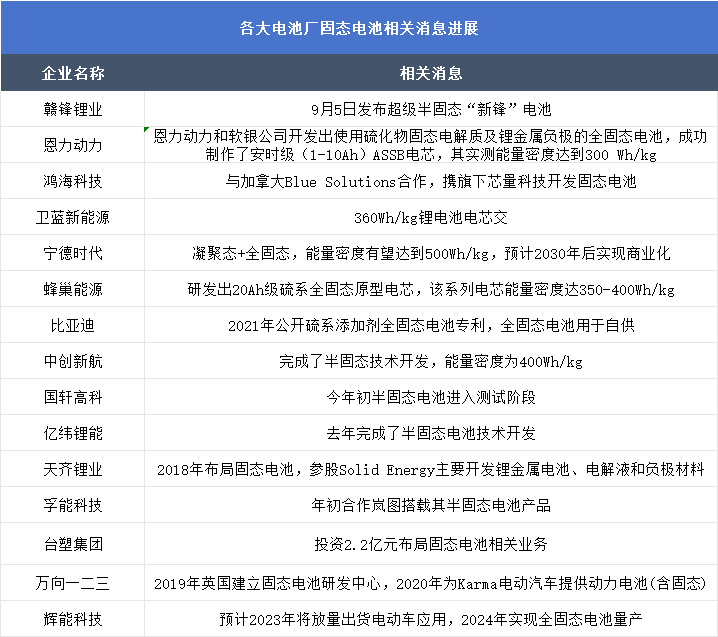 目前全球的電池廠中,大多數(shù)頭部企業(yè)以及部分實力雄厚的初創(chuàng)企業(yè),進入了固態(tài)電池的研發(fā),在國內(nèi)大部分企業(yè)先從逐漸降低電池中的電解液含量入手,先后推出半固態(tài)電池。