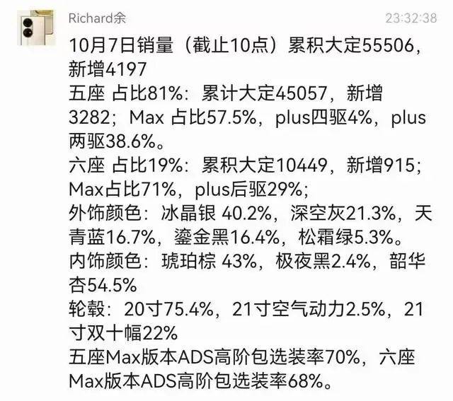 網(wǎng)上傳出的一份余承東在群里的聊天記錄,也印證了華為智駕對于用戶的吸引力。聊天記錄顯示,在問界5萬多的大定中,五座車型占比81%。而所有五座車型中,智駕MAX版本占57.5%。此外,選擇五座MAX的用戶里面,選裝ADS高階智駕包的占到了70%。
