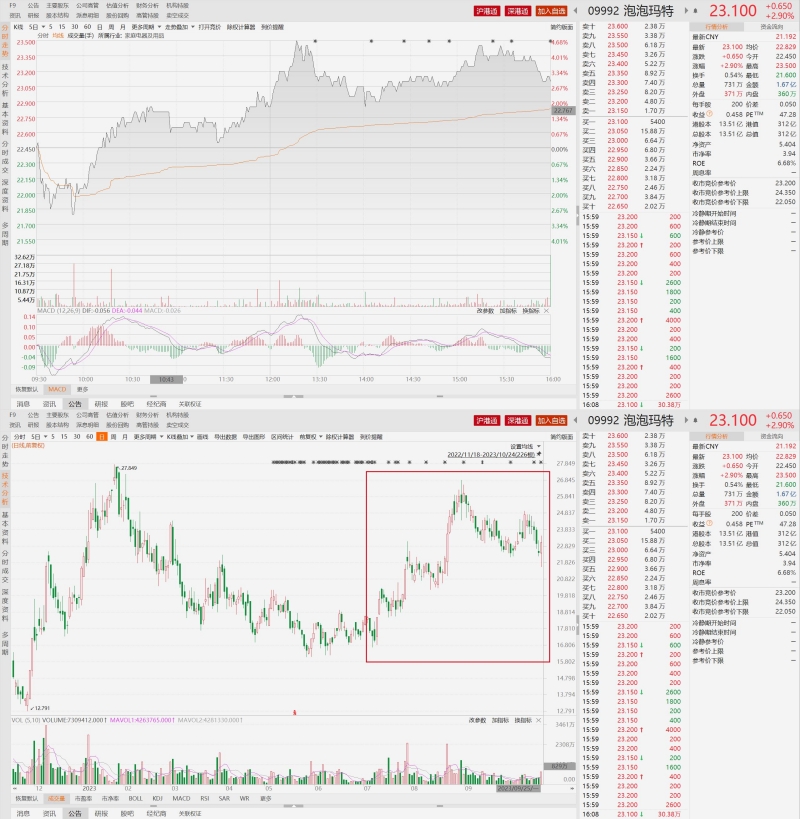 在公告了2023年第三季度最新業(yè)務狀況之后,泡泡瑪特股價于24日午后一度拉升漲4.68%(報23.50港元)。截至收盤,泡泡瑪特股價漲幅收窄,報收23.10元,漲2.90%。