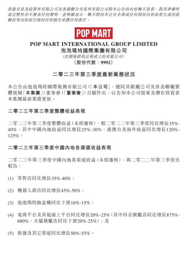 10月24日中午,泡泡瑪特(09992.HK)發(fā)布《2023年第三季度最新業(yè)務狀況》公告,2023年第三季度,泡泡瑪特的整體收益同比增長35%-40%,其中,中國內地收益同比增長25%-30%,港澳臺及海外收益同比增長120%-125%。