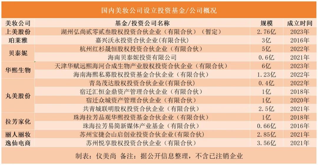 據(jù)儀美尚不完全統(tǒng)計(jì),近年來,至少有8家本土美妝企業(yè),成立了14家基金/投資公司,基金總規(guī)模近32億元。投資方向遍布美妝品牌、MCN機(jī)構(gòu)、合成生物、醫(yī)美機(jī)構(gòu)、代工廠、自媒體等。