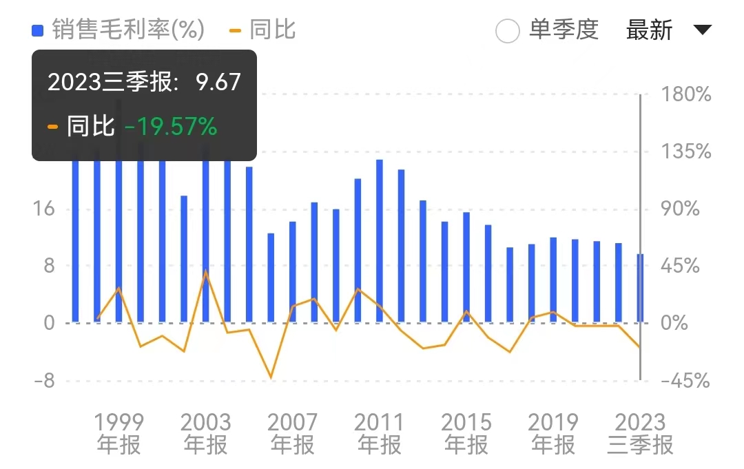 同花順數(shù)據(jù)顯示,今年第三季度,浪潮信息的銷售毛利率僅為7.82%,創(chuàng)下自2009年第四季度毛利率6.43%以來的最低值。在前三季度毛利率逐步下滑的情況下,公司前三季度的毛利率僅為9.67%,同比去年下降19.57%。對(duì)比歷年年報(bào)數(shù)據(jù),這一數(shù)字也創(chuàng)下公司自2000年上市以來的最低值。