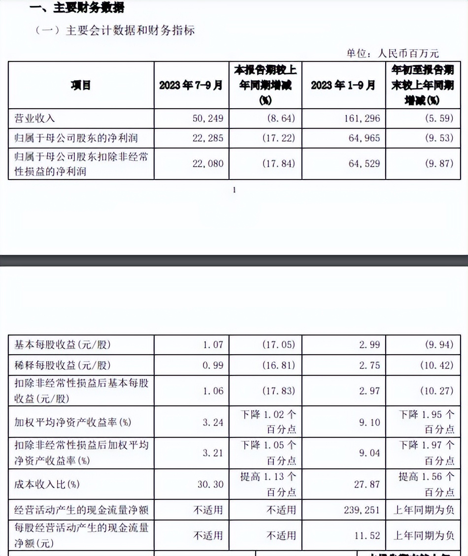 2023上半年,該行歸屬凈利潤(rùn)為426.80億元,2022年同期為448.87億元,同比下滑了4.92%——三季度看來是真慘。
