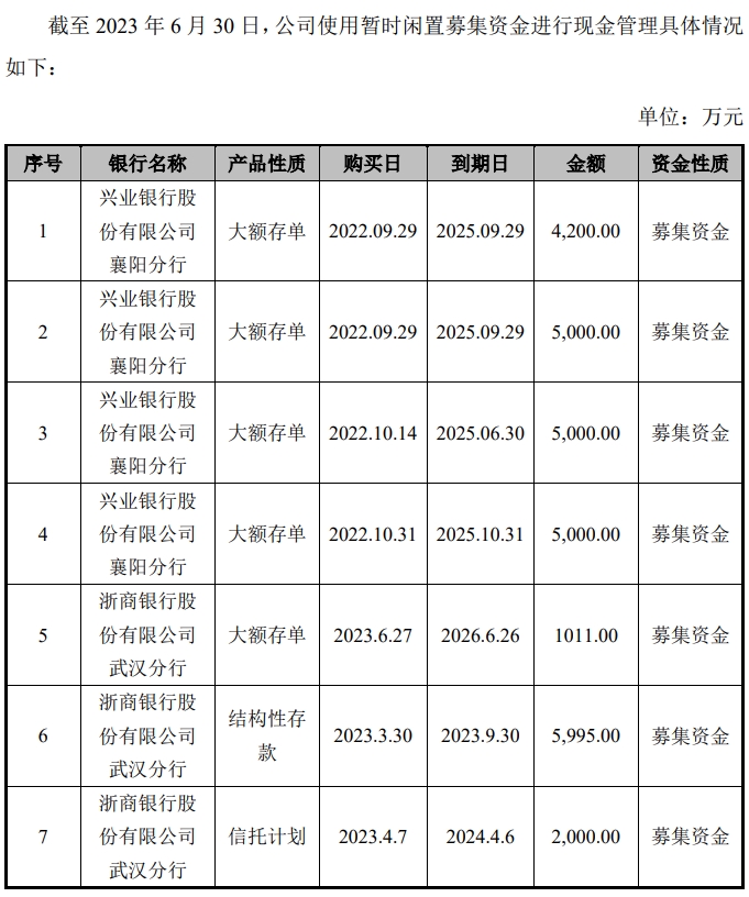 公司首次公開發(fā)行的股份數(shù)量為2240.08萬股,發(fā)行價格為每股41.27元,募集資金總額為人民幣9.24億元,實際募集資金凈額為人民幣8.09億元。根據(jù)2023年半年度募集資金存放公告顯示,公司、海通證券、中航證券分別與興業(yè)銀行襄陽分行、中國銀行襄陽分行、招商銀行武漢分行、浙商銀行武漢分行共同簽訂了《募集資金專戶存儲三方監(jiān)管協(xié)議》,截止到2023年6月30日,公司在上述幾家公司存放的募集資金余額1.37億元。