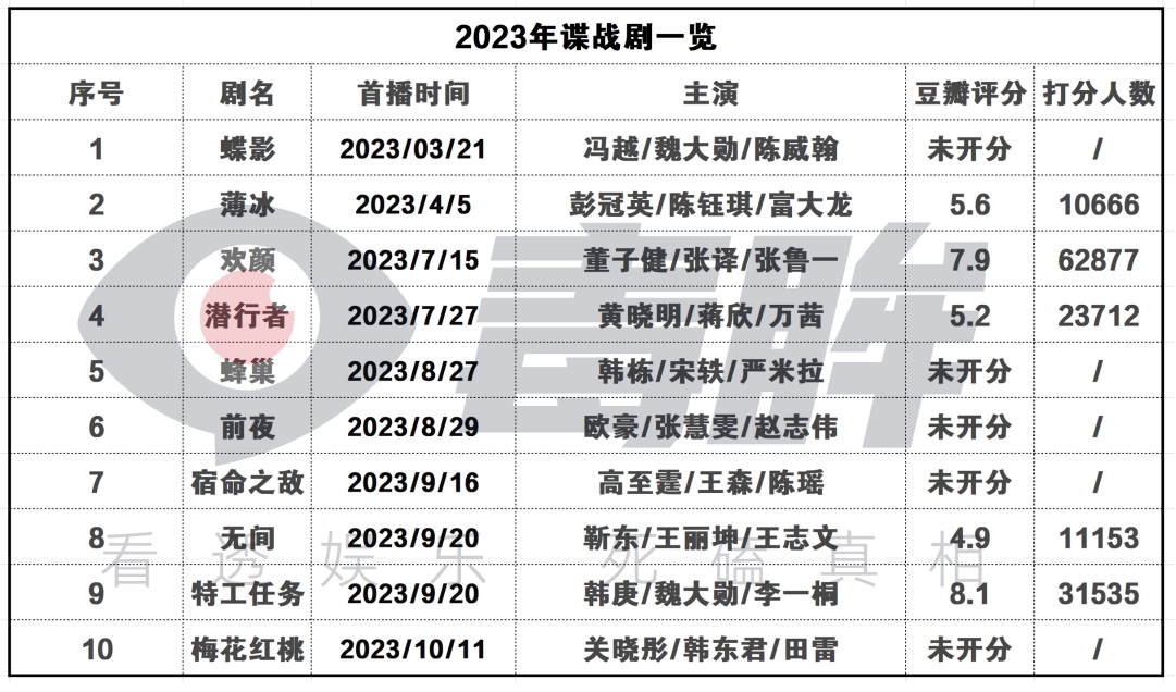 據(jù)毒眸不完全統(tǒng)計,2023年截至目前,播出的諜戰(zhàn)劇已經(jīng)超過10部,占上新劇數(shù)量的3.3%,比去年高出了1個百分點。