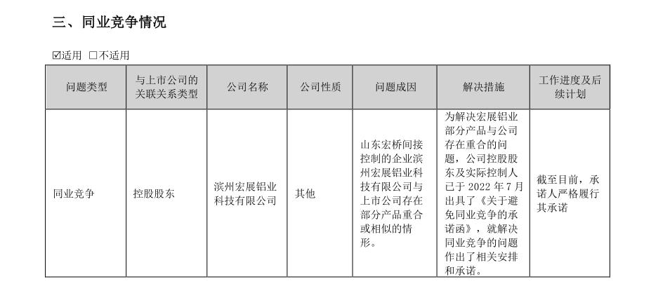 在隨后的2022年年報(bào)和2023年半年報(bào)中,宏創(chuàng)控股也再次承認(rèn)公司與宏展鋁業(yè)存在同業(yè)競(jìng)爭(zhēng)的情形,原因系“山東宏橋間接控制的企業(yè)宏展鋁業(yè)與上市公司存在部分產(chǎn)品重合或相似的情形”。