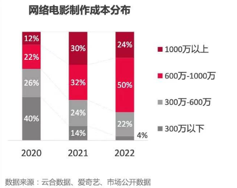 但這樣的速度趕不上行業(yè)大潮,云合《2022網(wǎng)絡(luò)電影年度報告》顯示,七成影片制作成本達600萬,而成本300萬以下的網(wǎng)絡(luò)電影從2020年的40%斷崖式下降至2022年的4%。