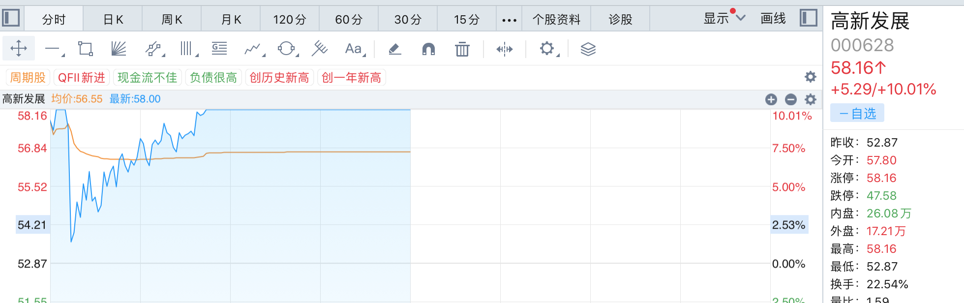 11月8日一早,恒潤股份(603985.SH)、高新發(fā)展(000628.SZ)等就高開,亞康股份(301085.SZ)、青云科技(688316.SH)等積極跟進。不過運行過半,表現(xiàn)有所分化,比如高開超9%的恒潤股份午時收盤跌了3.77%,之后繼續(xù)下挫,盤中跌逾6%。高新發(fā)展雖說也是盤中炸板,但多頭最終挺住,午時收盤時漲幅10.01%,午后漲停板打開。