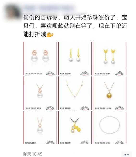 慶仔最近也發(fā)現(xiàn),周大福、周六福、菜百等主賣黃金的珠寶品牌,也開(kāi)始“大力”推銷珍珠飾品,“我當(dāng)初為了買金飾,為了盡早知道優(yōu)惠機(jī)制,加了好多品牌門店銷售微信,發(fā)現(xiàn)他們最近朋友圈推廣的內(nèi)容,珍珠的占比也多了起來(lái),之前我都不知道這些品牌還賣珍珠的?!?/p>