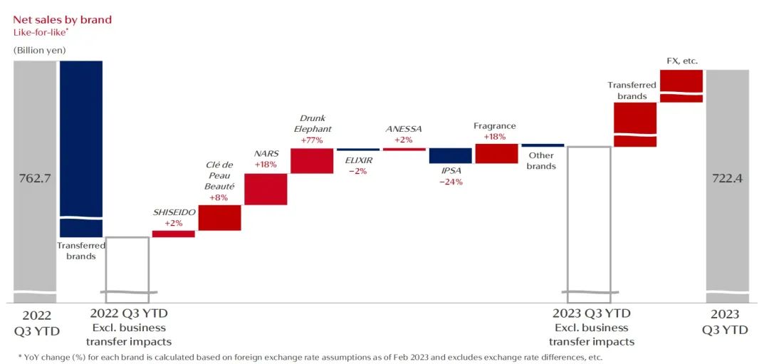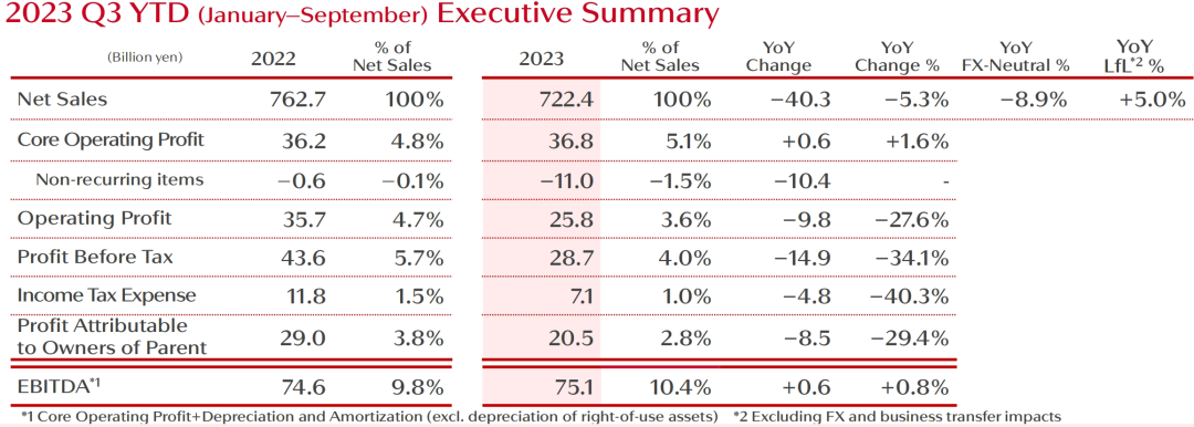 11月10日,資生堂集團披露截至2023年9月30日的前9個月業(yè)績。今年前三季度,資生堂凈銷售額為7224億日元(約合人民幣368.57億元,以報告匯率JPY19.6/CNY換算,下同),同比下降5.3%,按固定匯率計算同比減少8.9%,剔除匯率及業(yè)務轉讓影響,則同比增長了5%;同期,核心營業(yè)利潤為368億日元(約合人民幣18.78億元),同比微增1.6%。