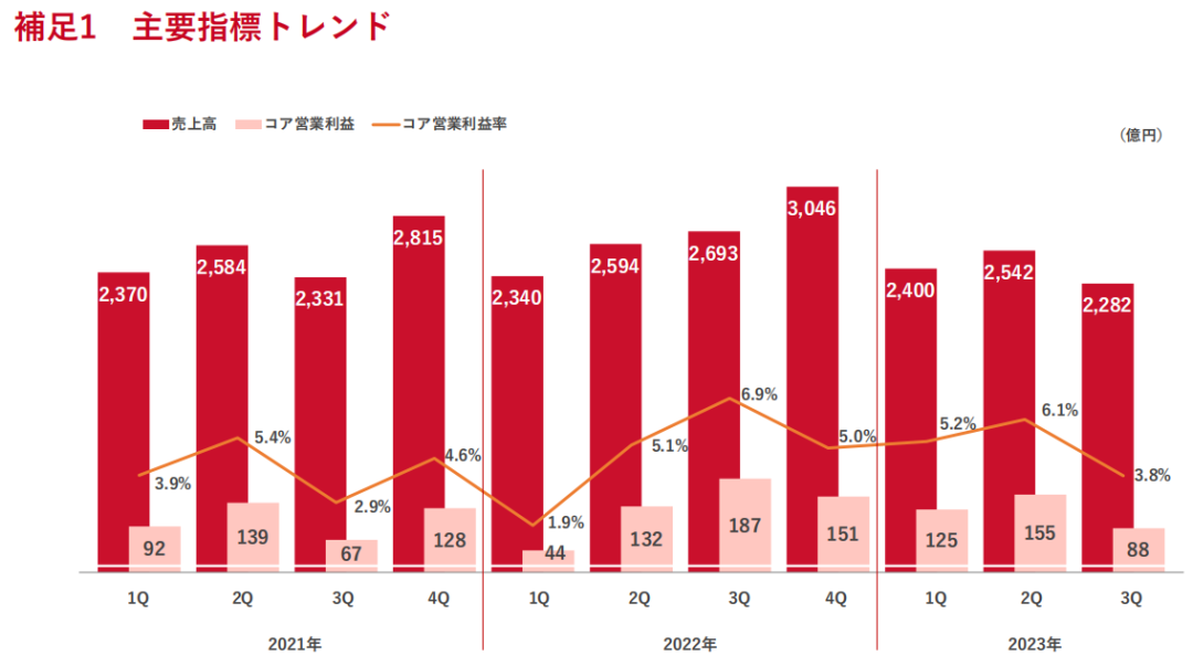 其中,Q3凈銷售額為2282億日元(約合人民幣116.43億元),同比下滑15%;核心經營利潤為88億日元(約合人民幣4.48億元),同比大跌約53%。綜合2021年Q1—2023年Q3業(yè)績來看,今年Q3的凈銷售額為11個季度中最低值,主要受到日本核污水排放事件的影響。
