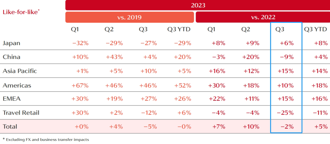 亞太地區(qū)在今年前三季度的凈銷售額為488億日元(約合人民幣24.9億元),同比上漲0.1%。另外,美洲、EMEA地區(qū)(歐洲、中東和非洲三地區(qū))、旅游零售業(yè)務的凈銷售額則分別下滑16.6%、8.0%、9.7%、44.1%。