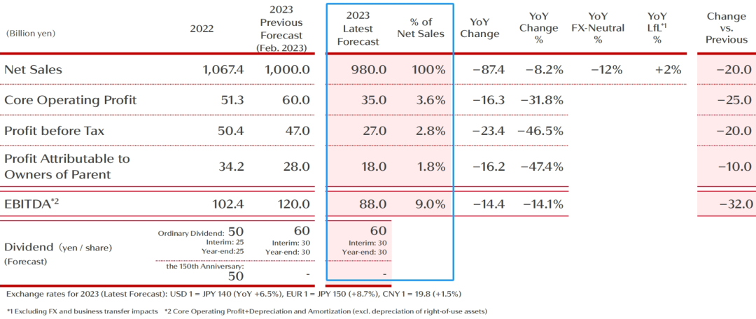 資生堂表示,以JPY19.8/CNY的匯率預測,2023年凈銷售額為9800億日元(約合人民幣495億元),同比下降8.2%;核心營業(yè)利潤350億日元(約合人民幣17.68億元),同比下滑31.8%;歸母凈利180億日元(約合人民幣9.09億元),同比下降47.4%。