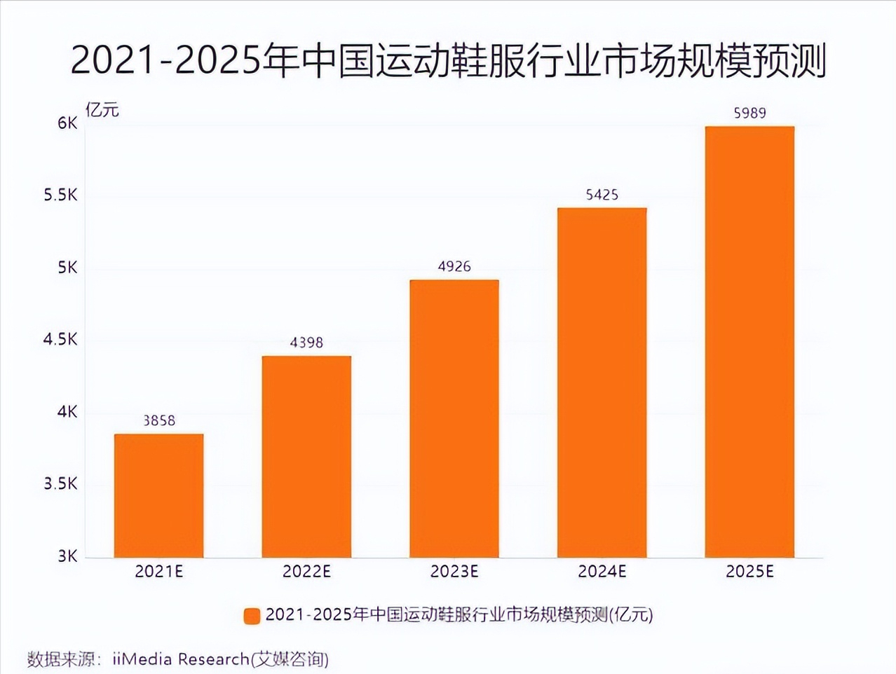 可以看出,中國(guó)市場(chǎng)仍將是阿迪達(dá)斯未來(lái)十分重要的戰(zhàn)場(chǎng),而為何如此重視這片市場(chǎng),主要還是因?yàn)槭袌?chǎng)前景廣闊、消費(fèi)群體龐大。艾媒咨詢(xún)數(shù)據(jù)顯示,2021年我國(guó)運(yùn)動(dòng)鞋服市場(chǎng)規(guī)模達(dá)3858億元,預(yù)計(jì)2025年將達(dá)到5989億元。抓住了中國(guó)市場(chǎng)就意味著企業(yè)發(fā)展可觀的“錢(qián)景”。