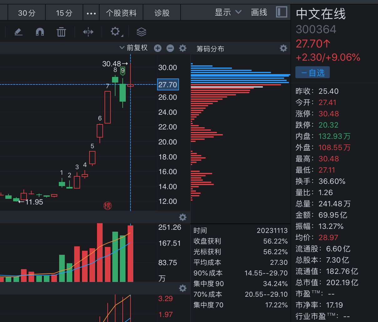 需要指出的是,自10月31日算起,中文在線的累計(jì)漲幅已經(jīng)翻倍,達(dá)到了114.4%,區(qū)間振幅更是有129.72%,區(qū)間換手率達(dá)到254.91%。據(jù)同花順軟件,市場籌碼的平均成本為27.3元。這也是中文在線年內(nèi)第二次“作妖”。