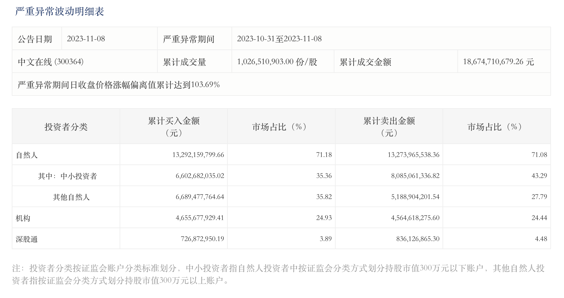 界面新聞注意到,中文在線的大漲,也構(gòu)成了嚴(yán)重異常波動(dòng),從交易所披露的情況來看。10月31日至11月8日,自然人累計(jì)買入金額132.92億元,市場占比71.18%,累計(jì)賣出金額132.74億元,市場占比71.08%;而機(jī)構(gòu)方面累計(jì)買入金額46.56億元,市場占比24.93%,累計(jì)賣出金額45.65億元,市場占比為24.44%。機(jī)構(gòu)自然人的參與度不足“37開”。