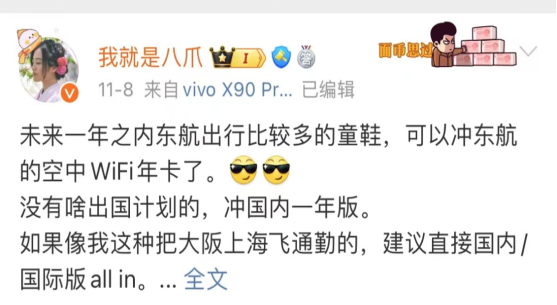 如果說“我就是八爪”代表了年輕差旅人士因公對空中WIFI的剛性需求,那么,更多年輕人則是因為純粹想提升個人飛行體驗而追求空中WIFI自由,其中留學生、旅游發(fā)燒友們、社交達人們是急先鋒。